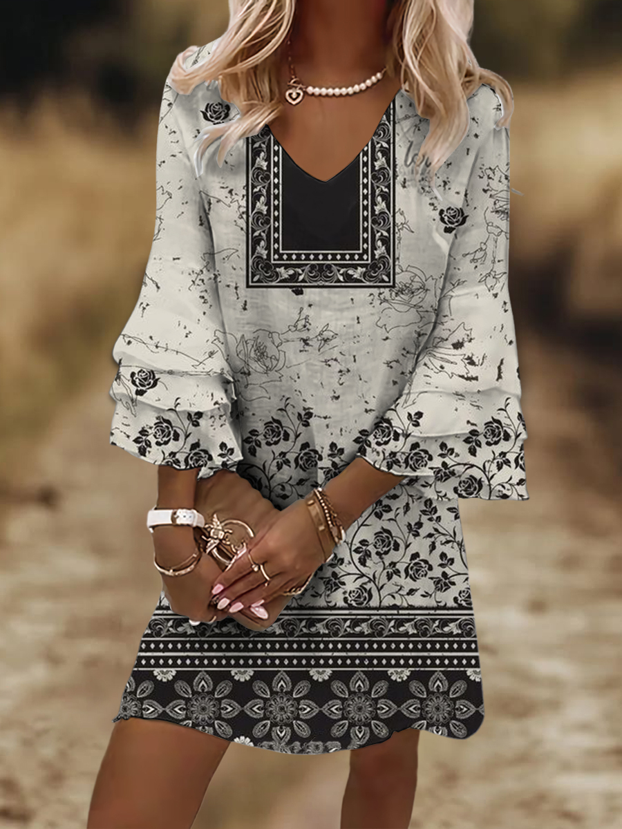 Women’s Vintage Western Colorful Embroidered Floral Print Flare Sleeve V Neck Loose Dress