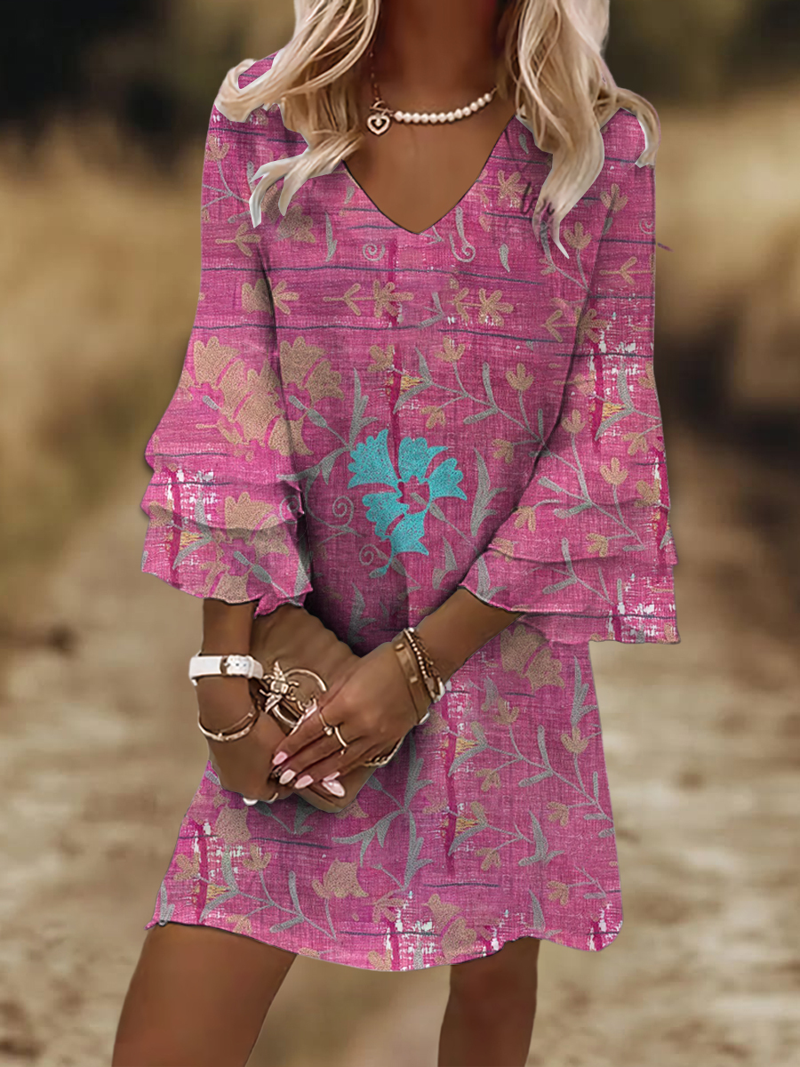 Women’s Vintage Western Ethnic Colorful Floral Leaf Print Flare Sleeve V Neck Loose Dress