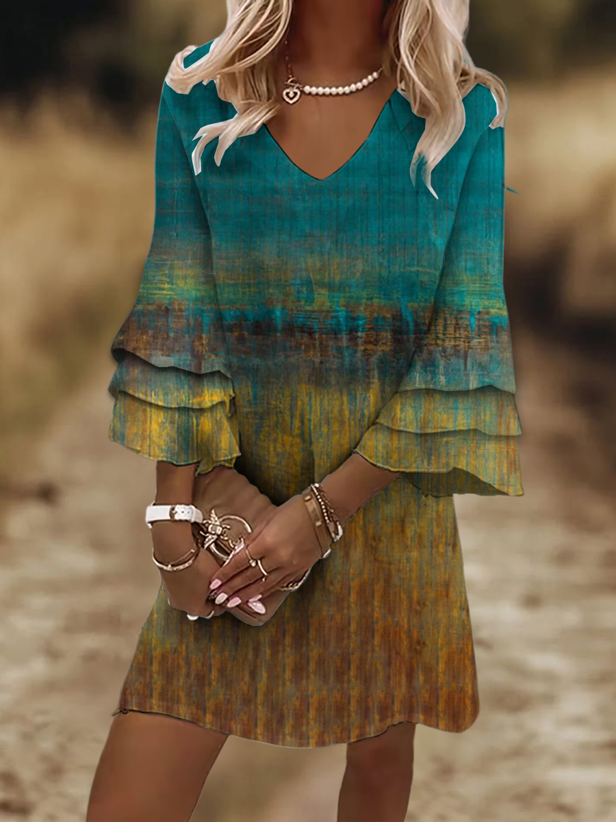 Women’s Vintage Western Ethnic Colorful Gradient Abstract Art Print Flare Sleeve V Neck Loose Dress