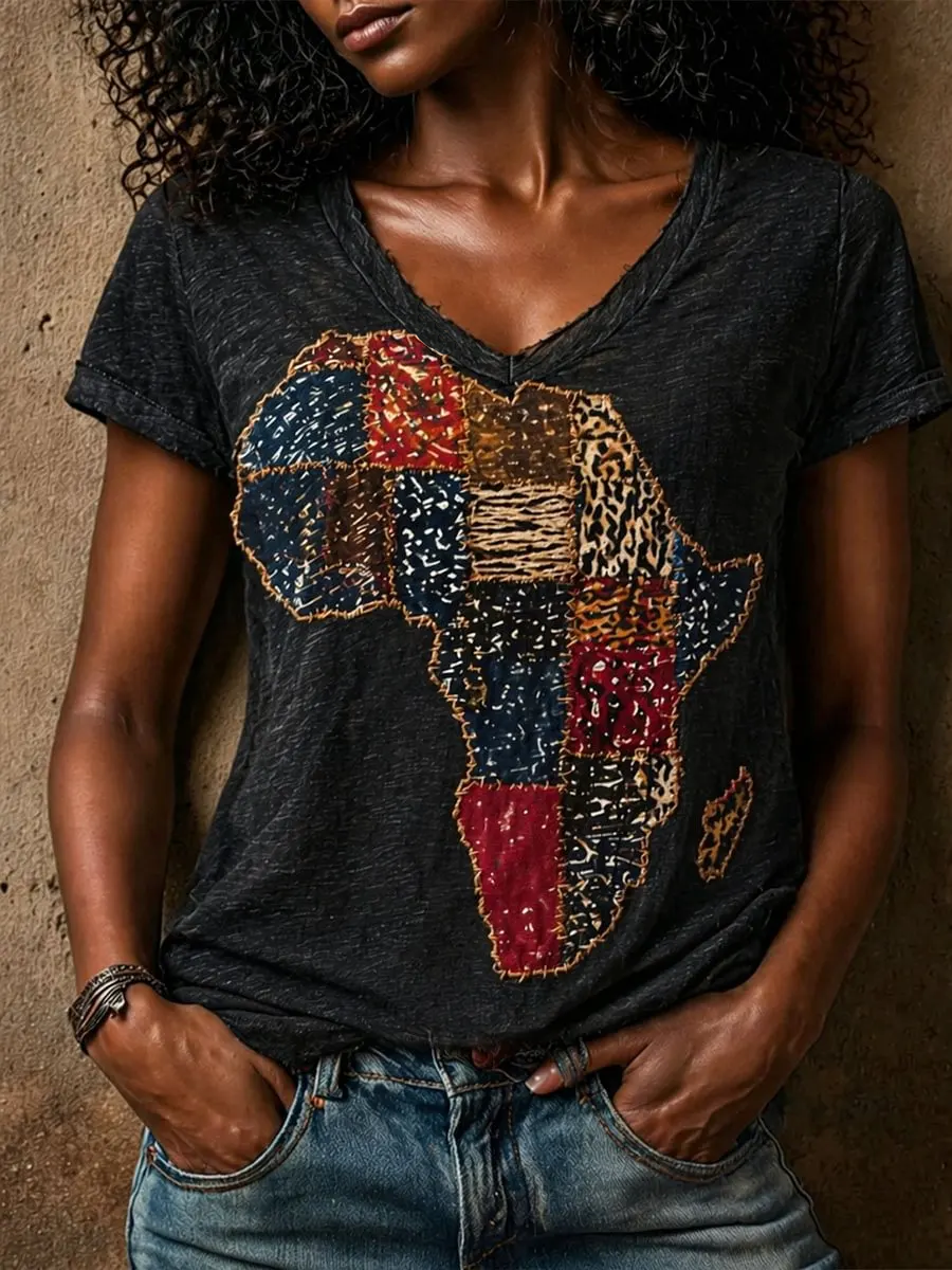 Women's African Map Patchwork Graphic linen short-sleeved T-shirt