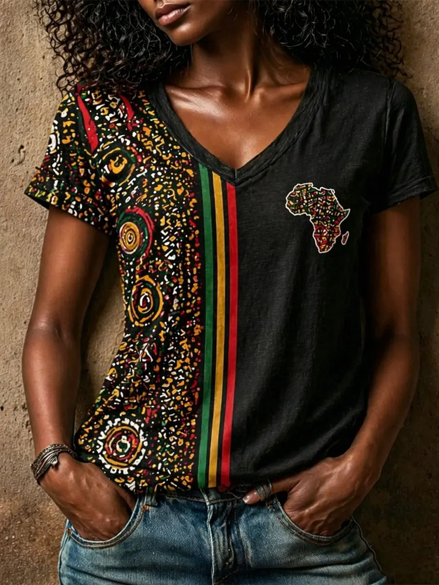 Women's African Map Patchwork Print linen short-sleeved T-shirt