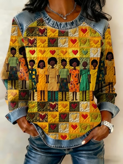 Women's Black Women Portrait Art Print Denim Patchwork Top