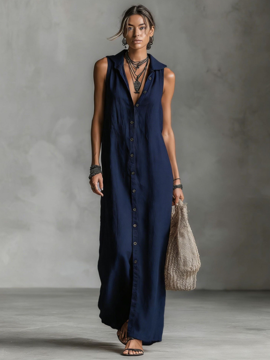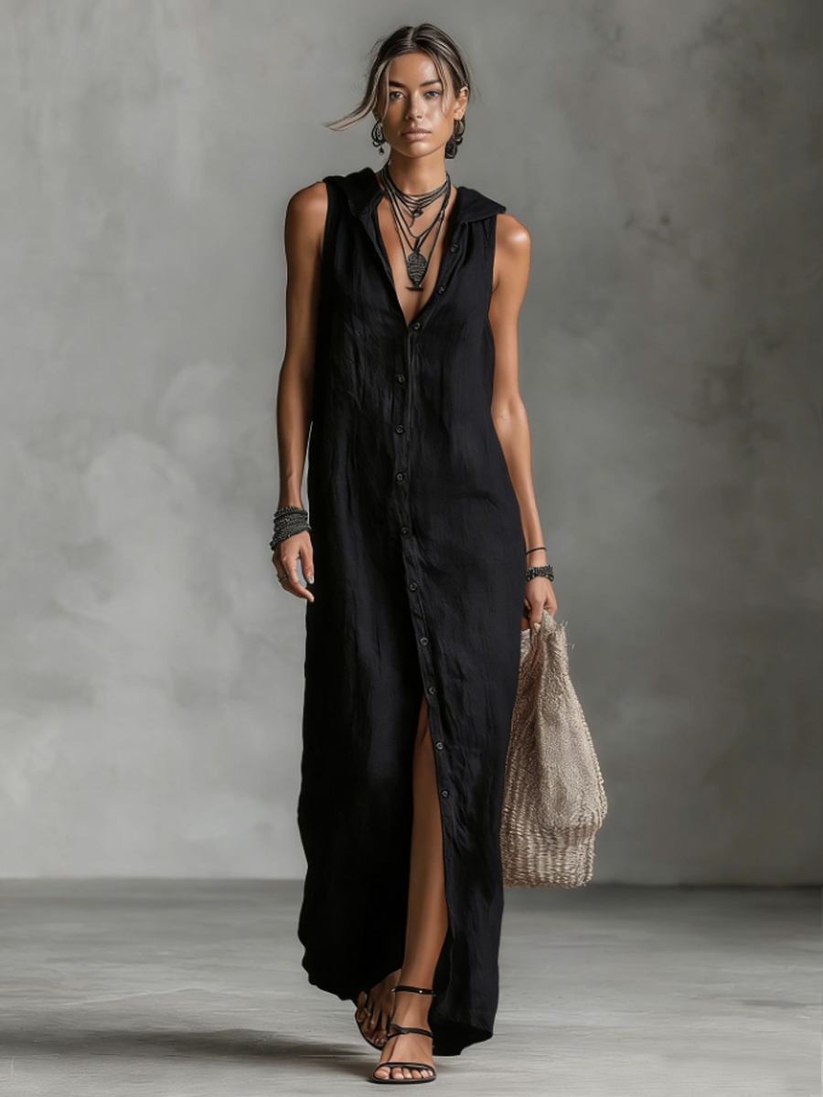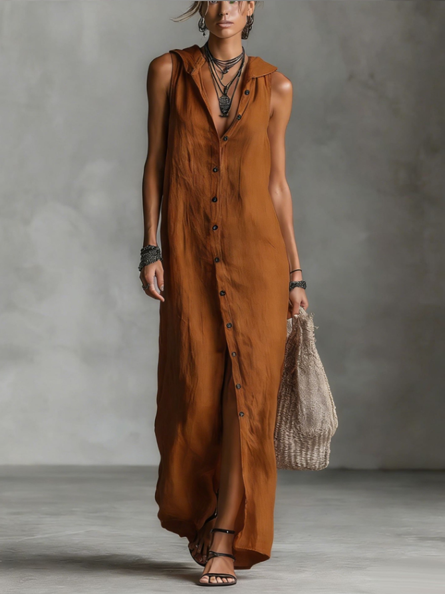 Women's casual loose sleeveless single-breasted cotton linen hooded dress