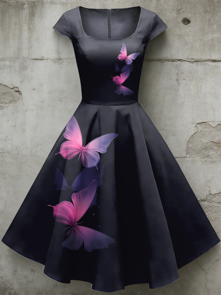 Women's Casual U-Shaped Collar Short Sleeve Butterfly Print Short Sleeve Dress