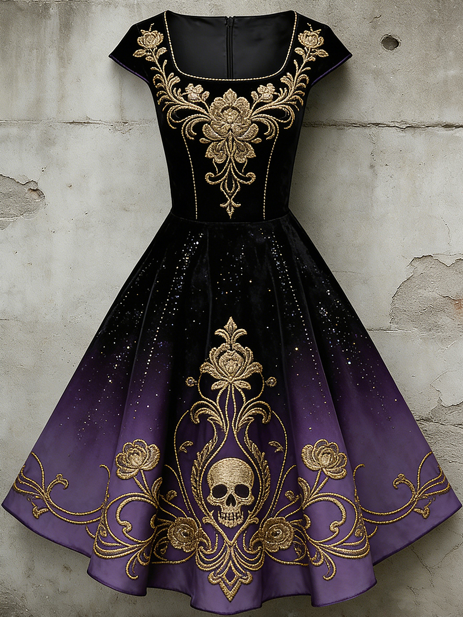 Women's Casual U-Shaped Collar Short Sleeve Floral Skull Print Short Sleeve Dress