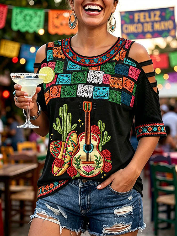 Women's Cinco De Mayo Art Printed Off-shoulder T-shirt