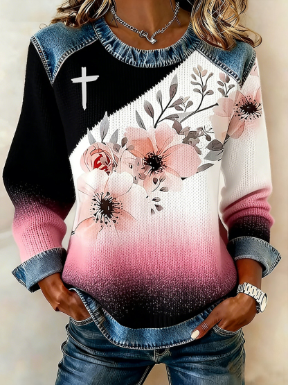 Women's Cross Flowers Denim Patchwork Top