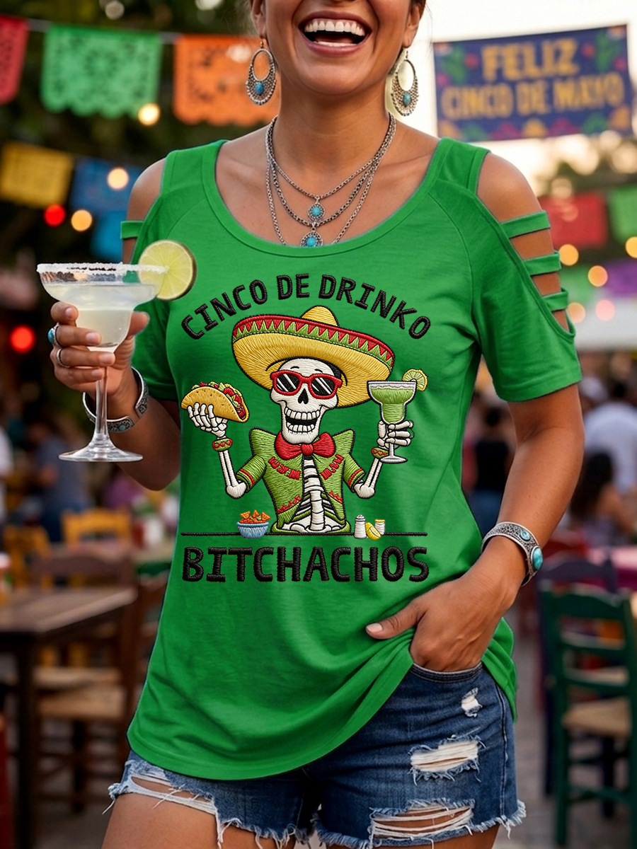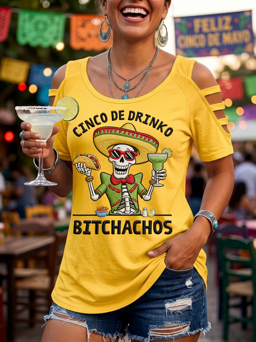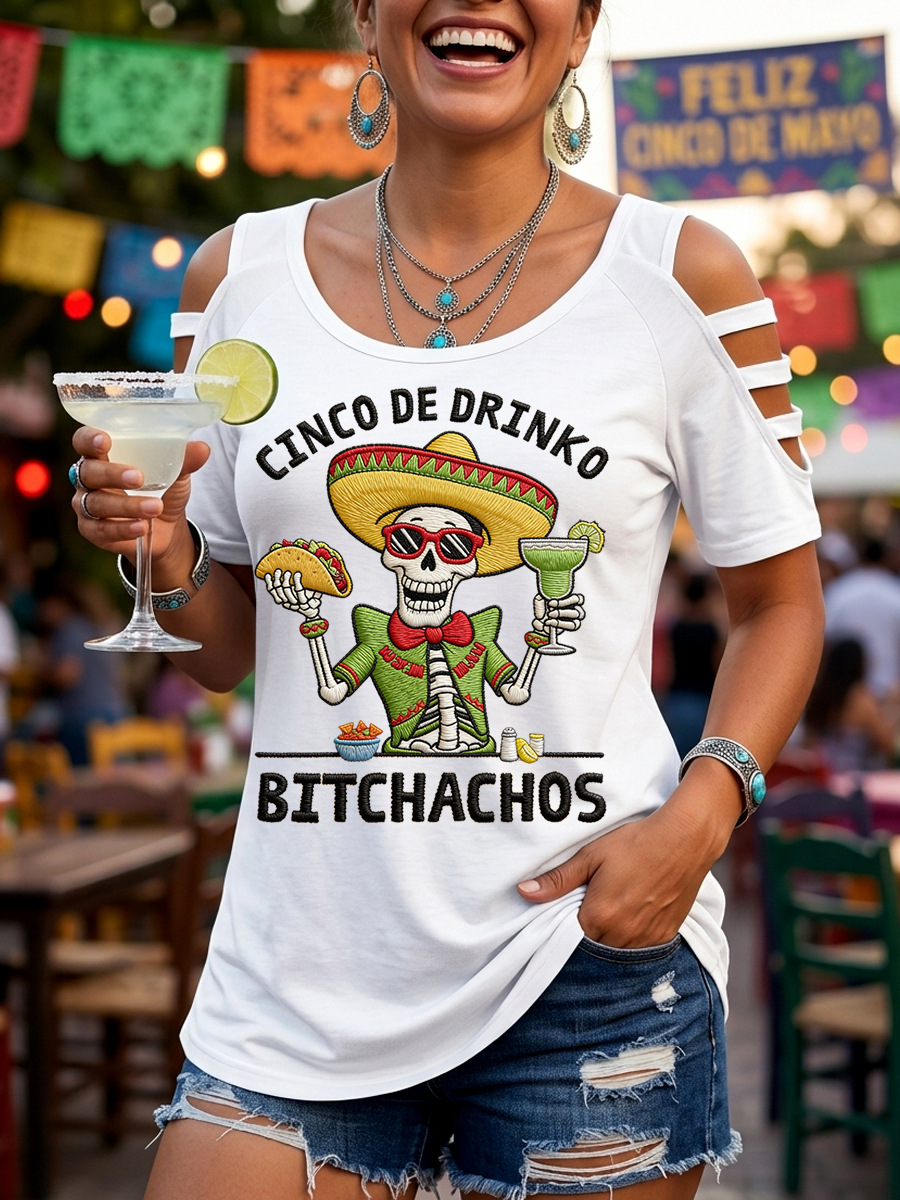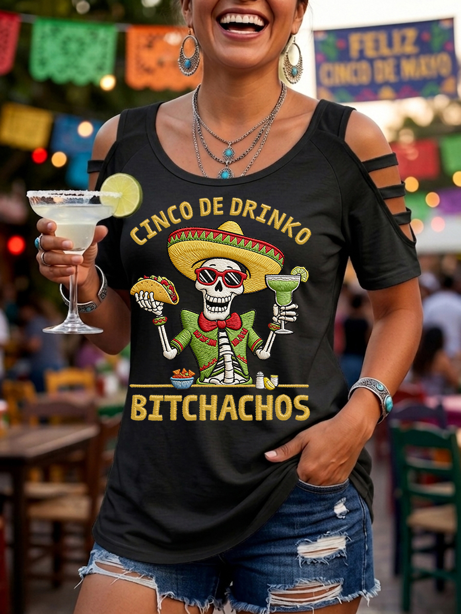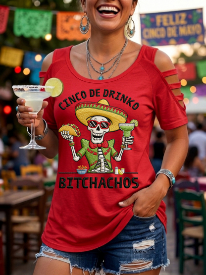 Women's Funny Cinco De Drinko Bitchachos Skeleton Print Casual Top