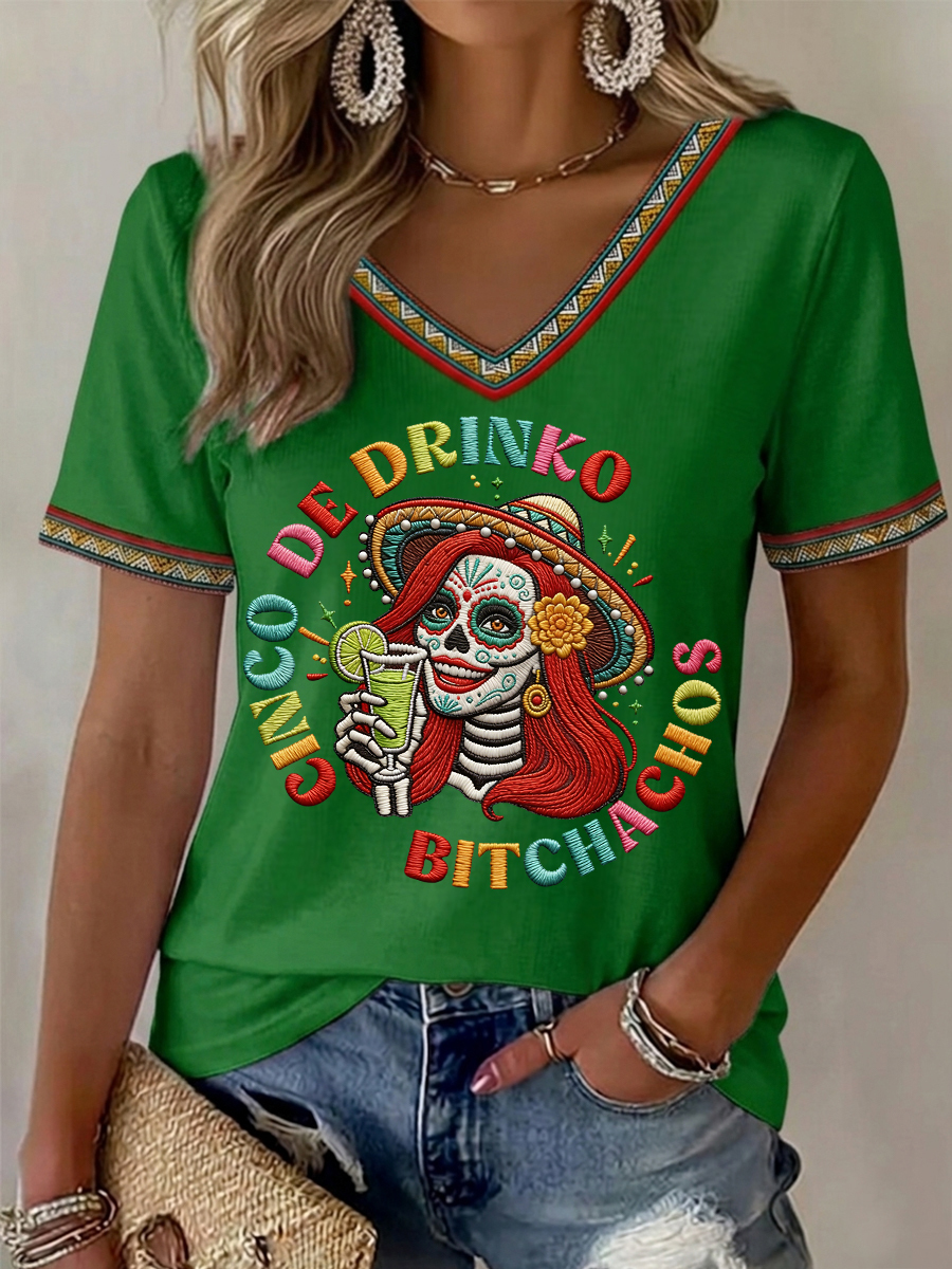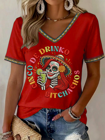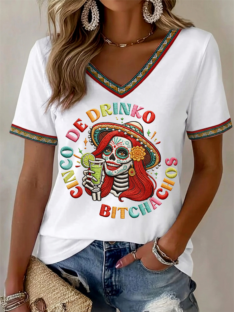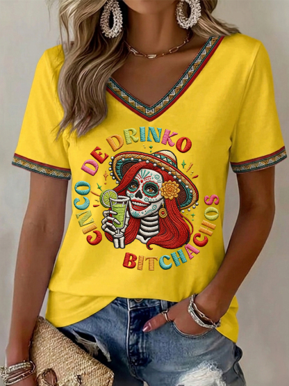 Women's Funny Cinco De Drinko Bitchachos Skeleton Print Casual V-Neck Tee