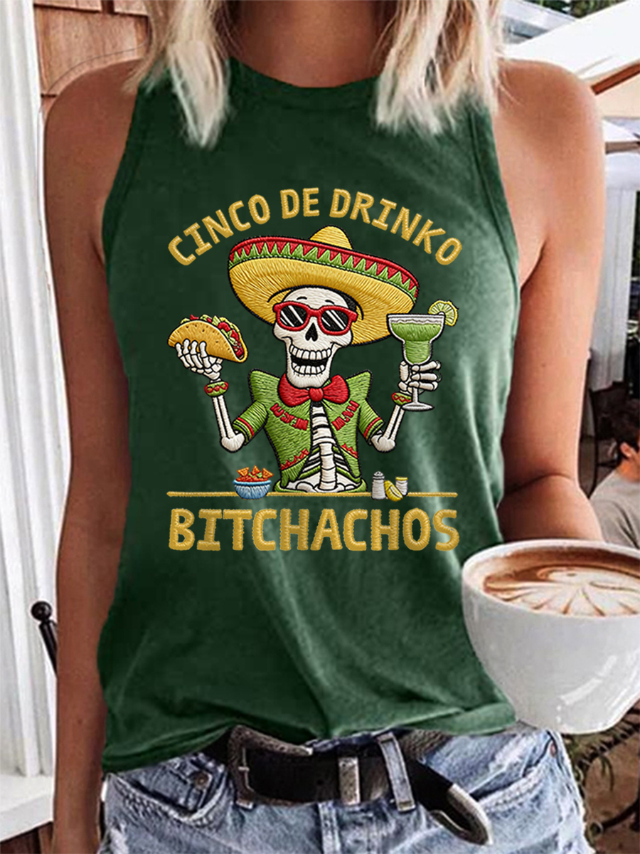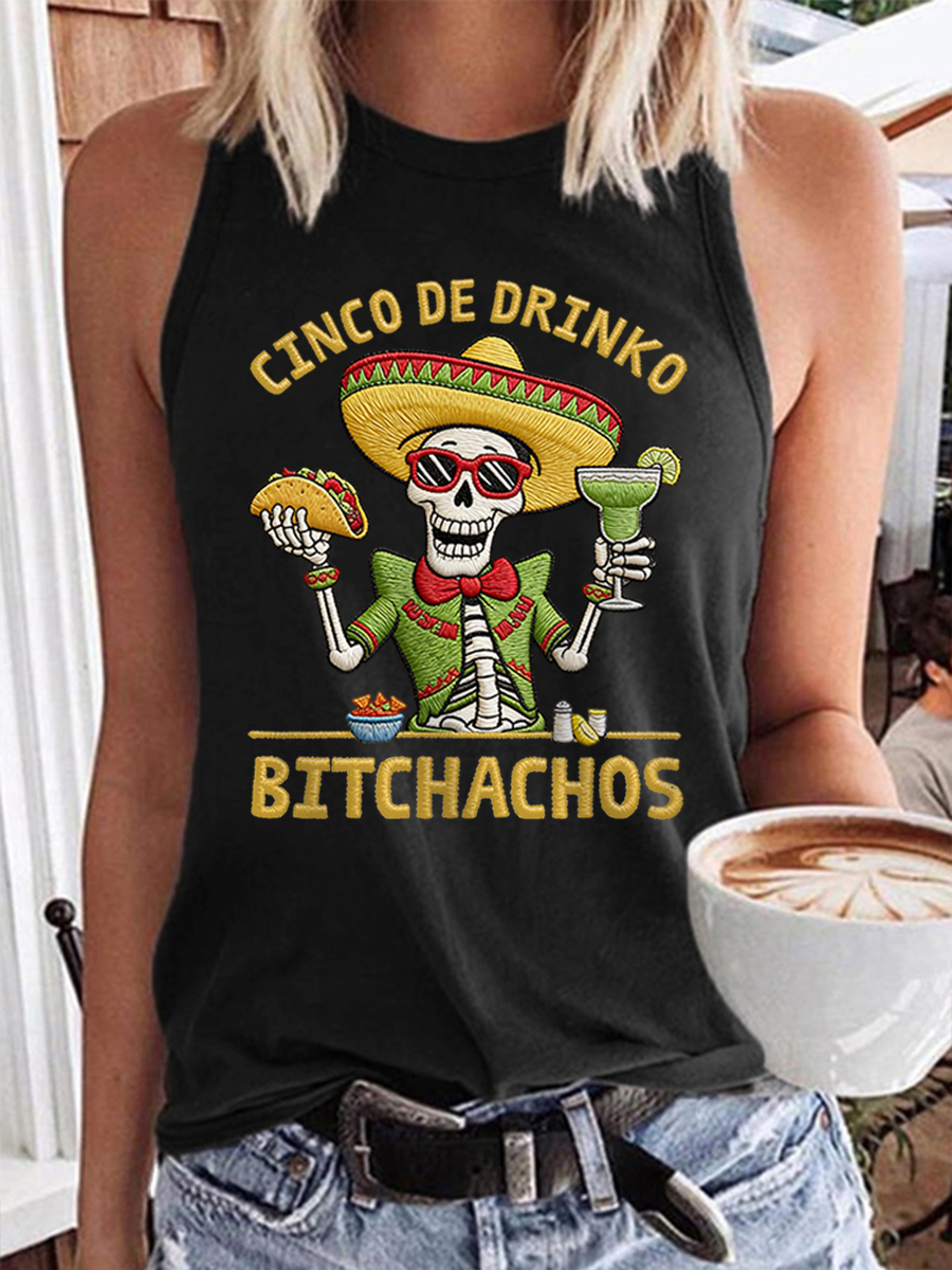 Women's Funny Cinco De Drinko Bitchachos Skeleton Print Casual Vest