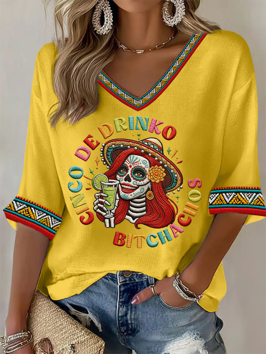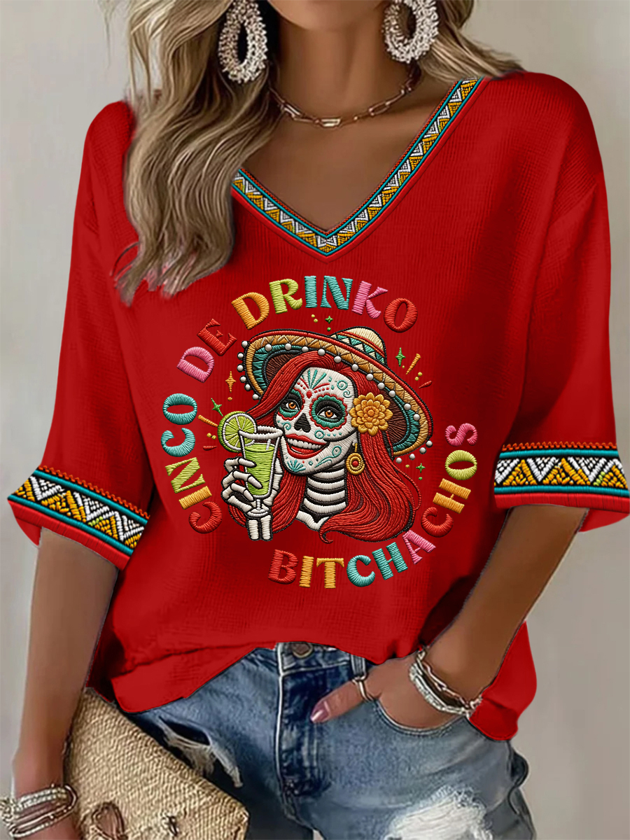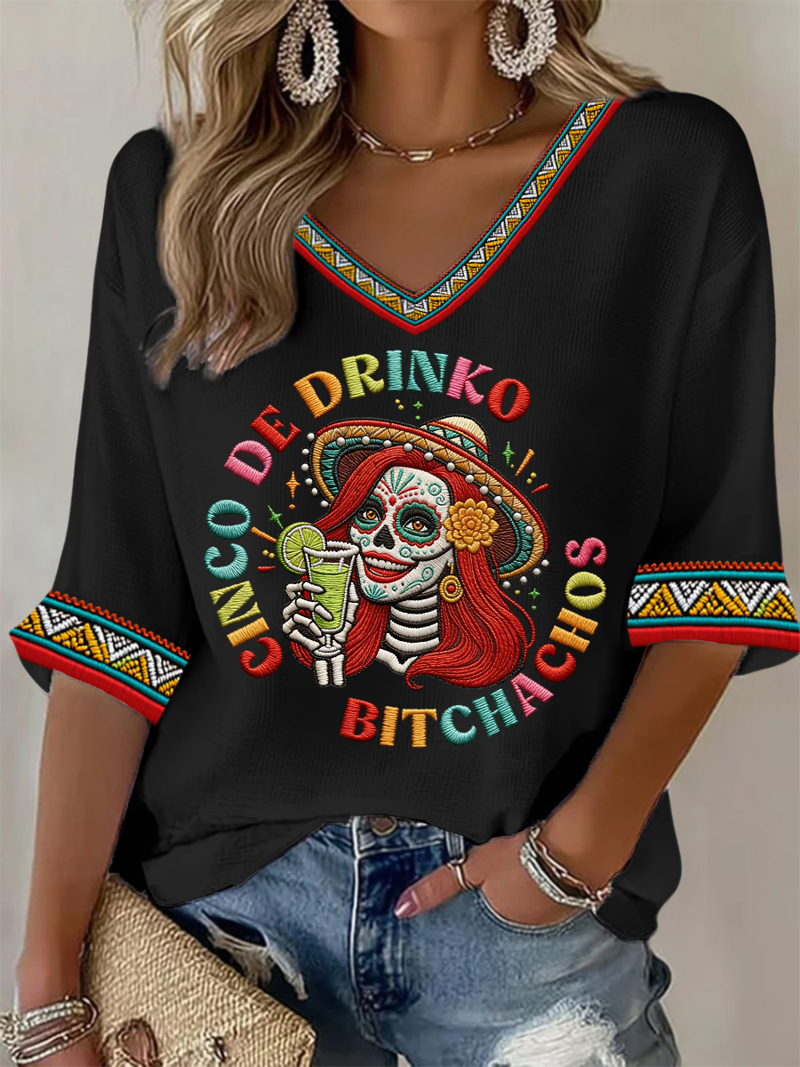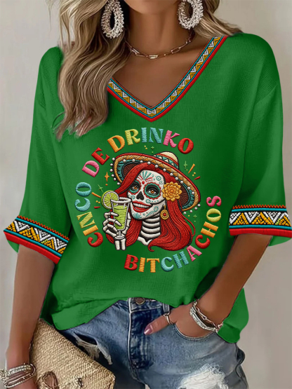 Women's Funny Cinco De Drinko Bitchachos Skeleton Print Casual Waffle Top