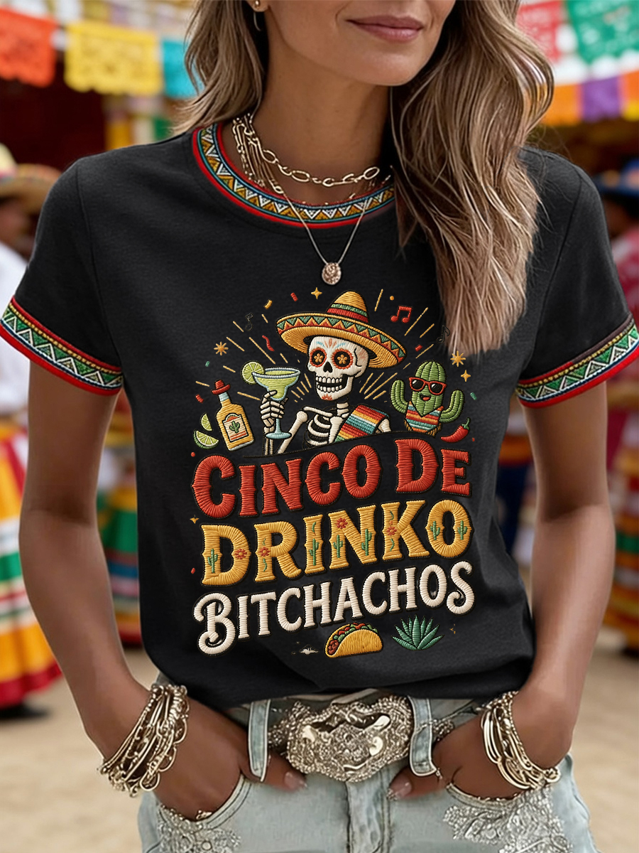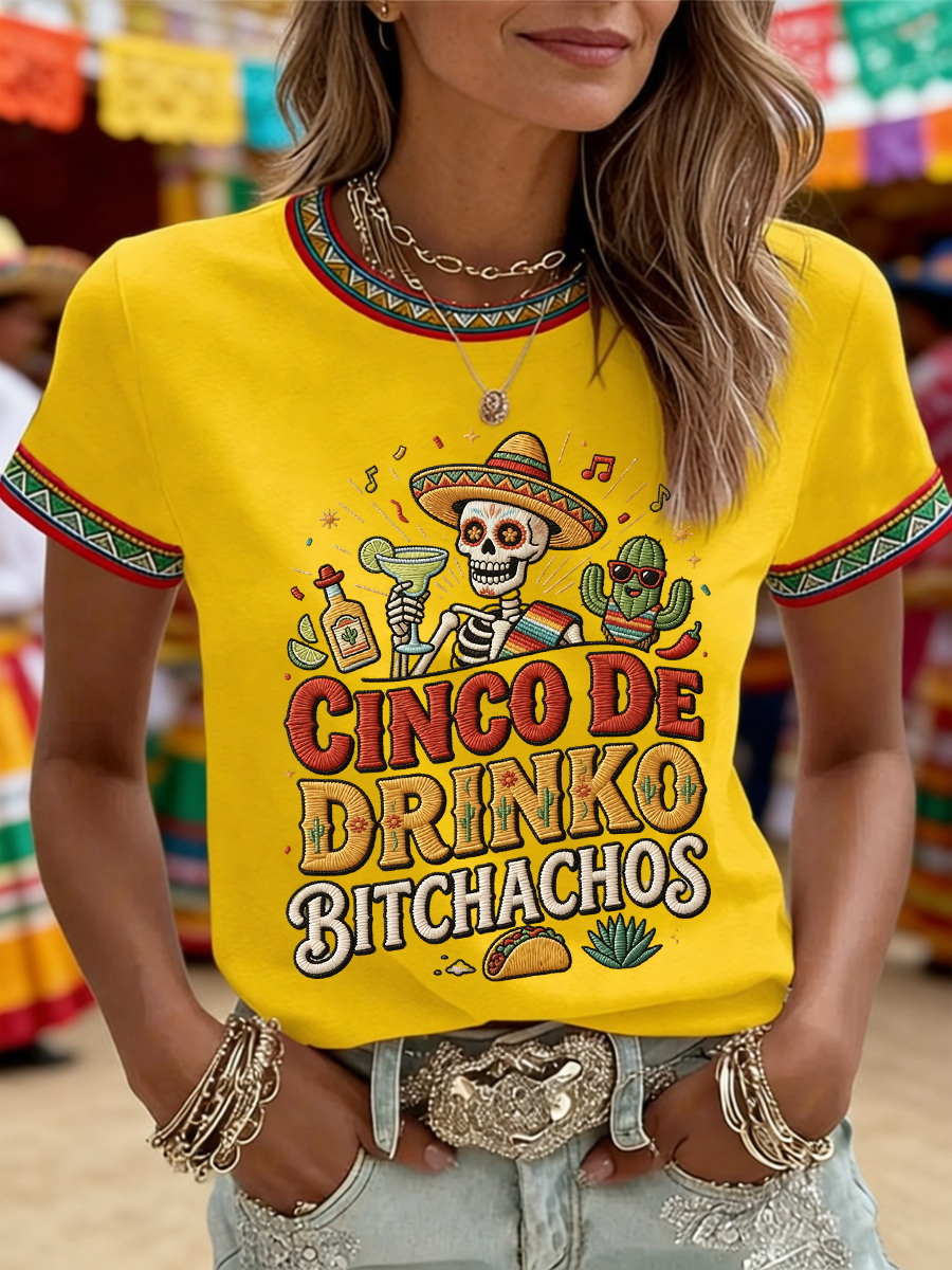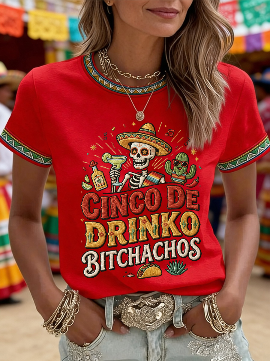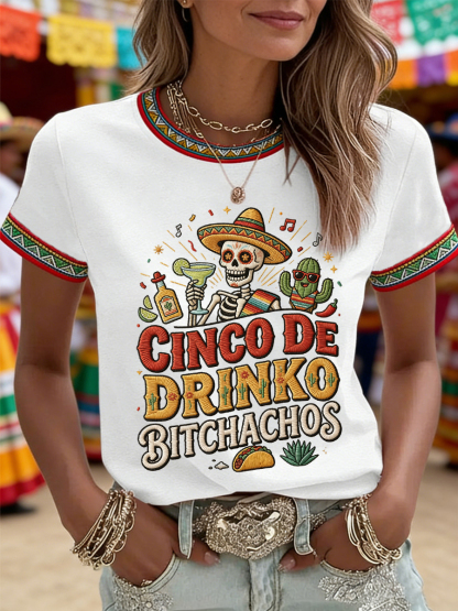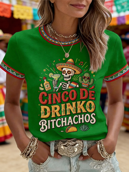 Women's Funny Cinco De Drinko Bitchachos Skull Print Tee