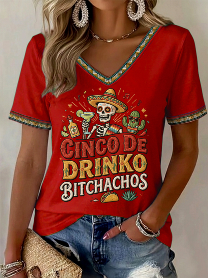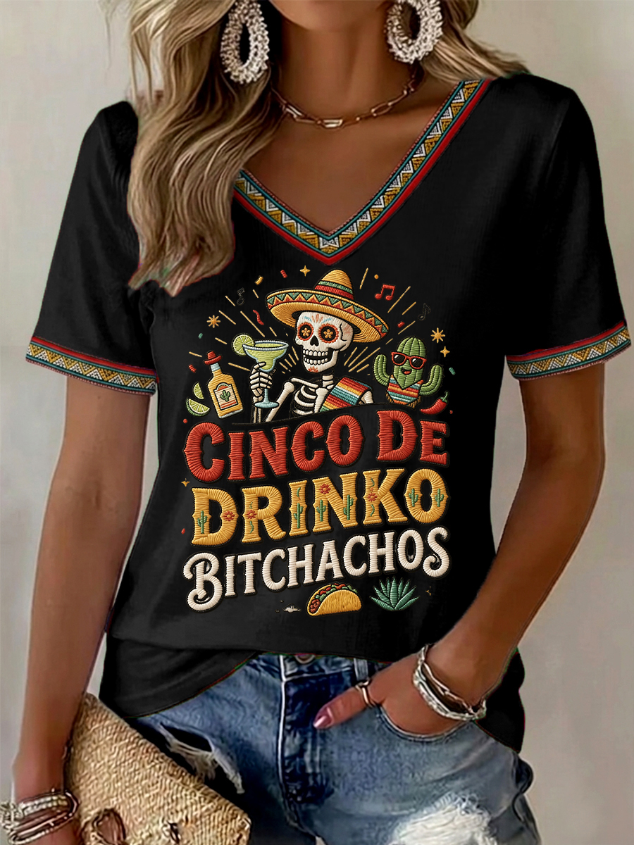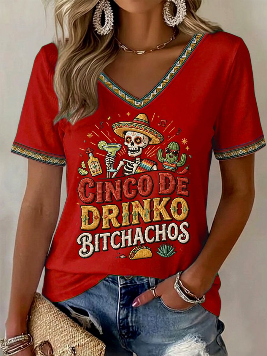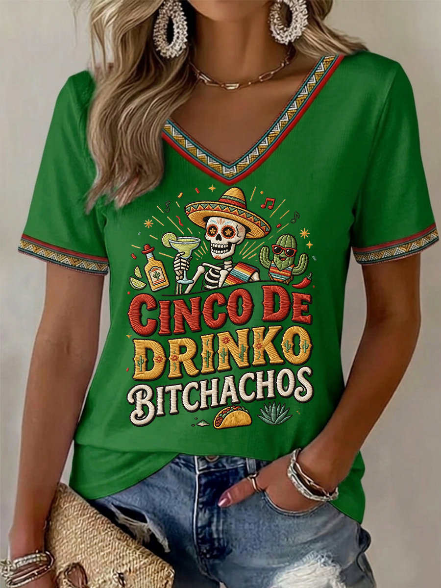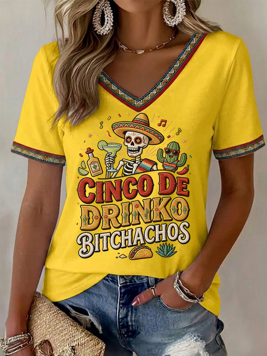 Women's Funny Cinco De Drinko Bitchachos Skull Print V-Neck Tee