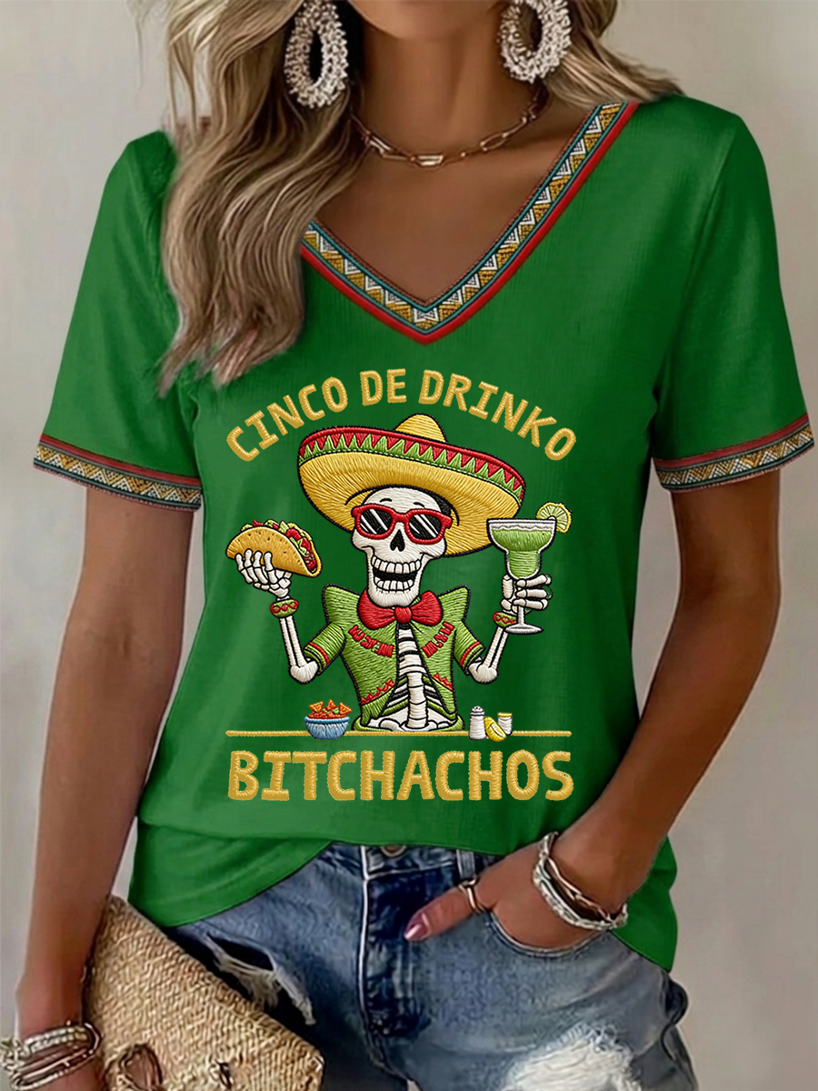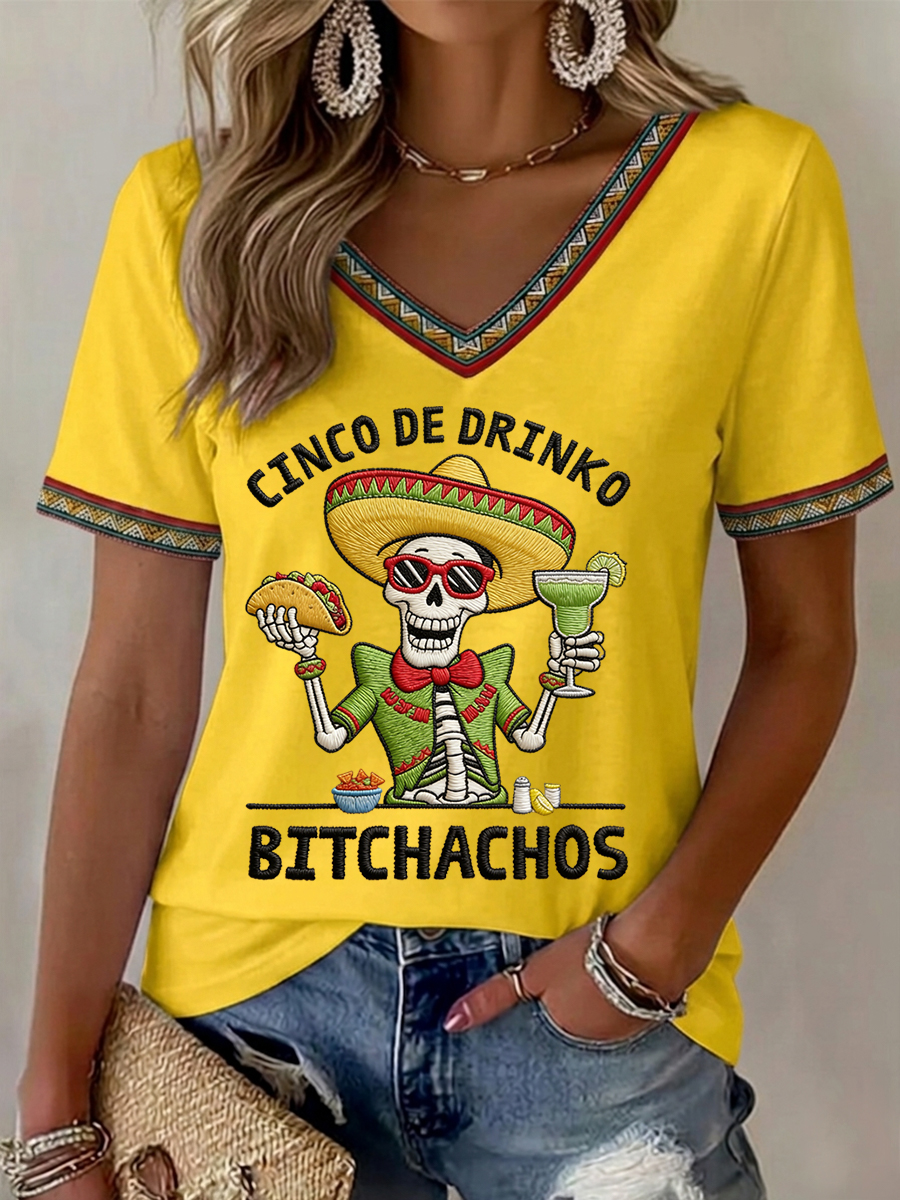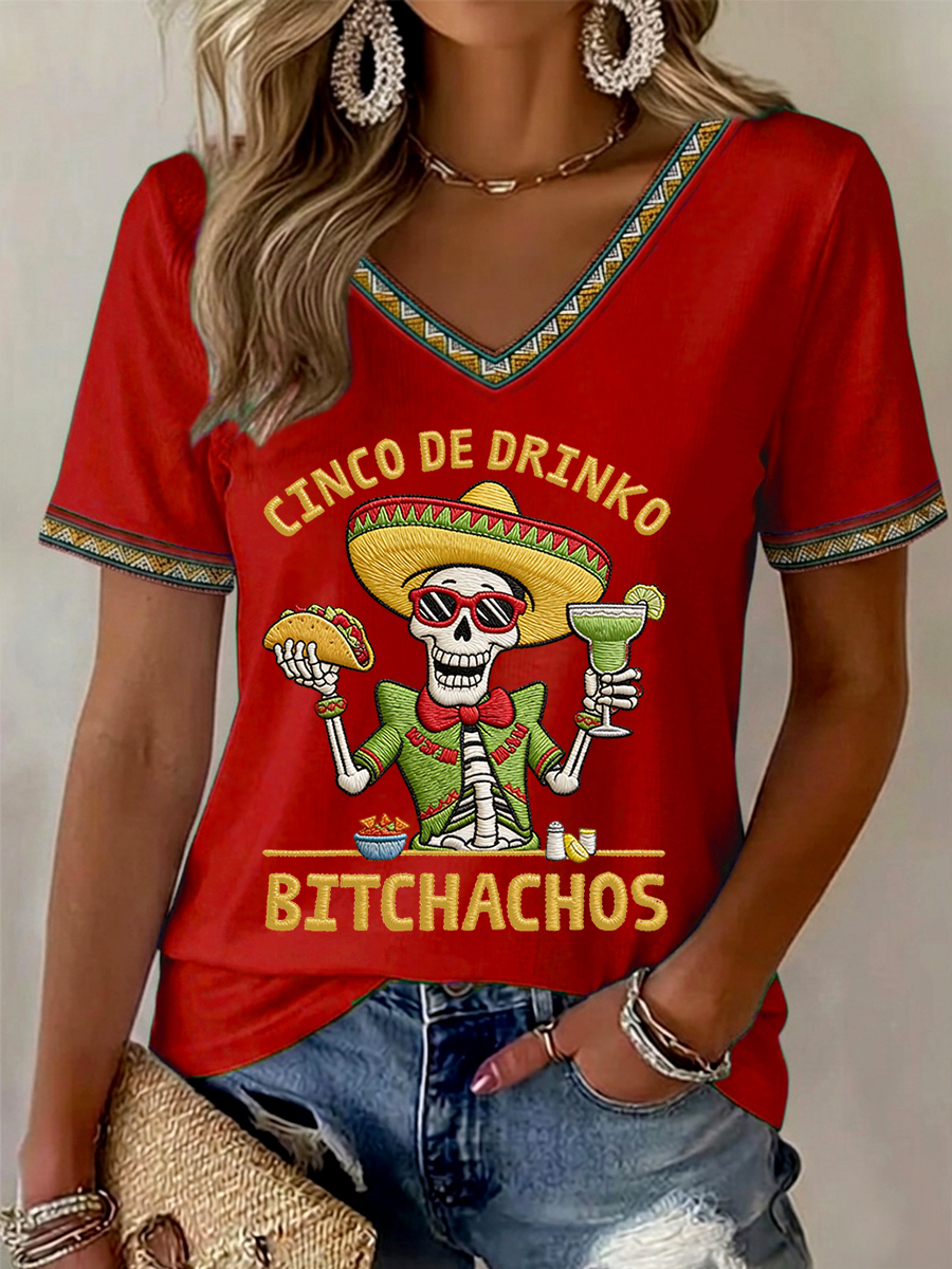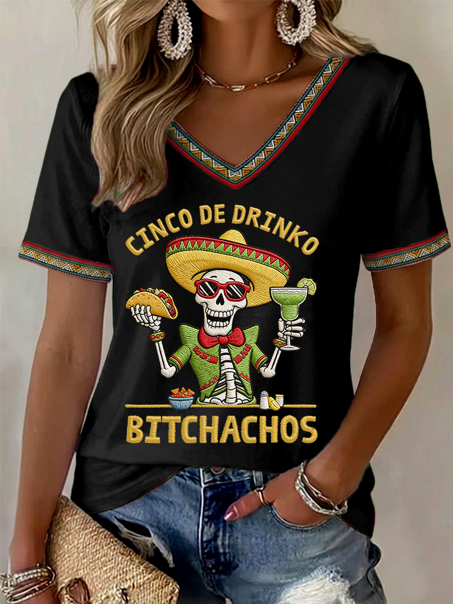 Women's Funny Cinco De Mayo Bitchachos Skull Print V-Neck Tee