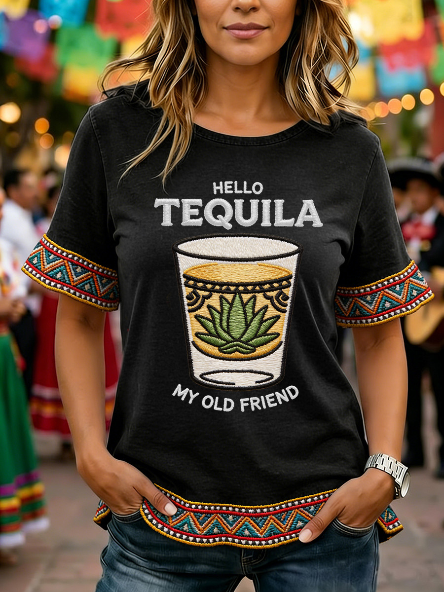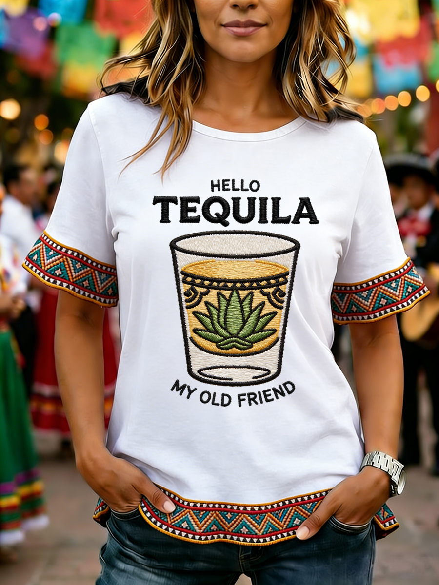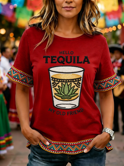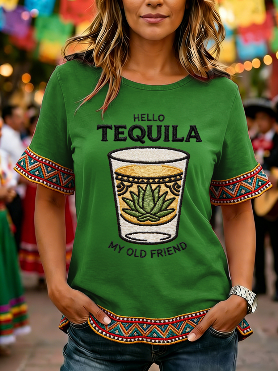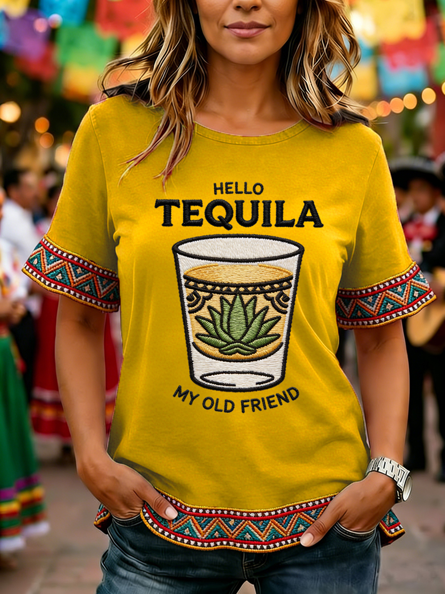 Women's Funny HELLO TEQUILA MY OLD FRIEND Cinco De Mayo Print Casual Ruffle Sleeve Tee