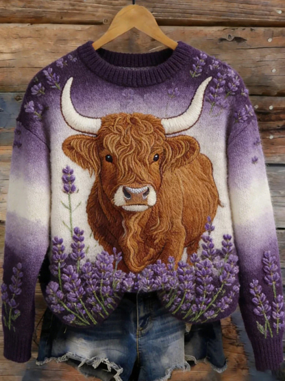 Women's Funny Highland Cow Floral Art Cozy Sweater