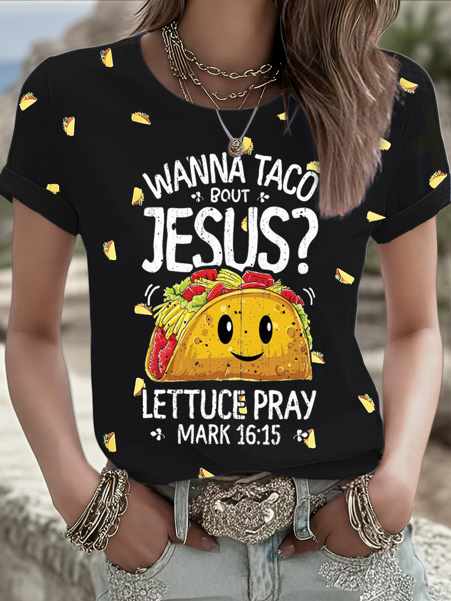 Women's Funny Wanna Taco Bout Jesus Cinco De Mayo Printed T-shirt