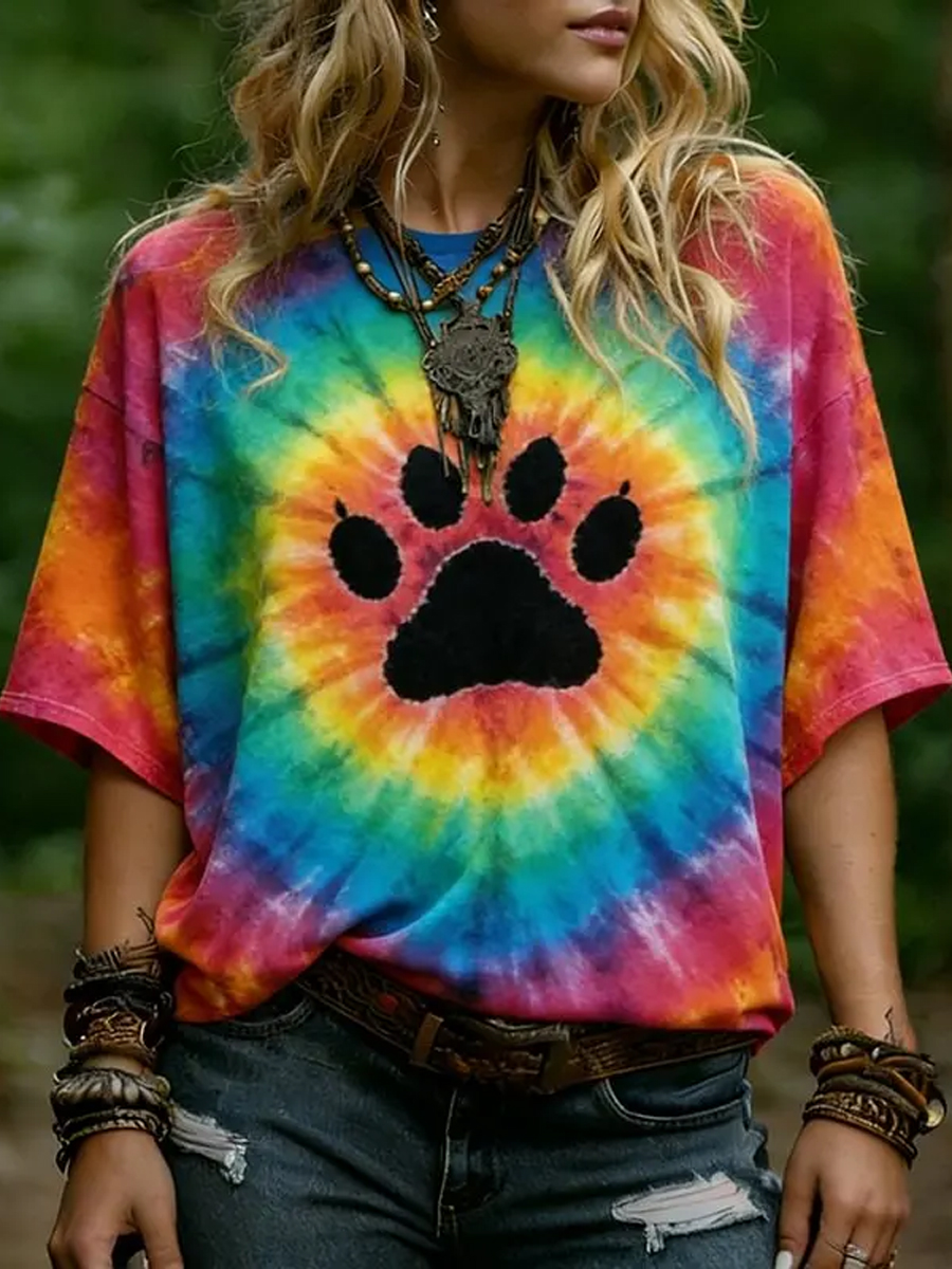 Women's Hippie Abstract Paws Tie-dye Pattern Casual T-shirt