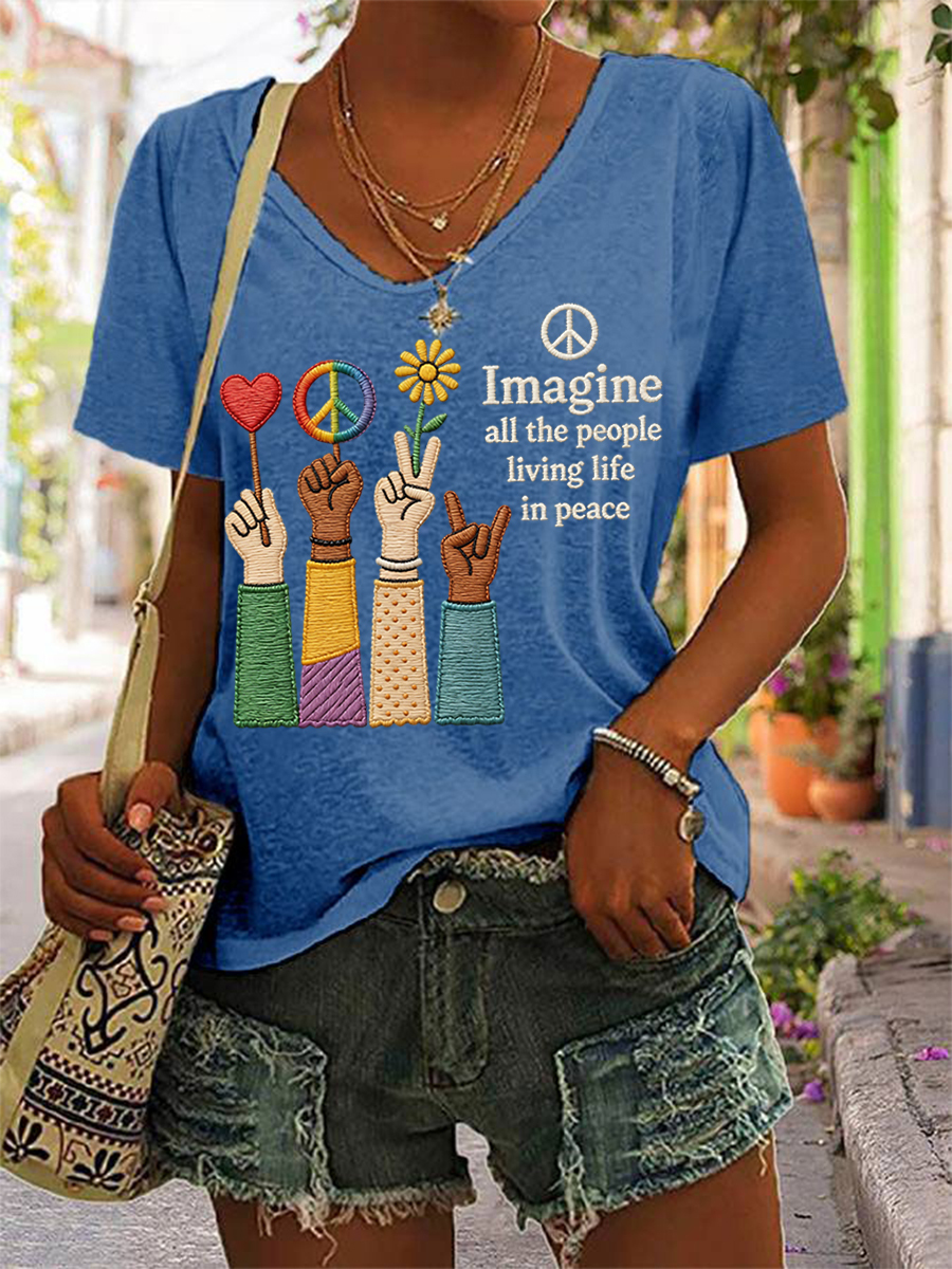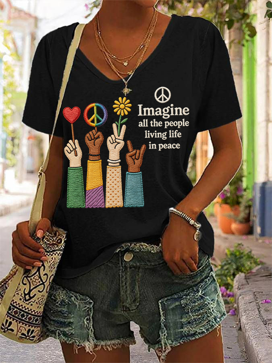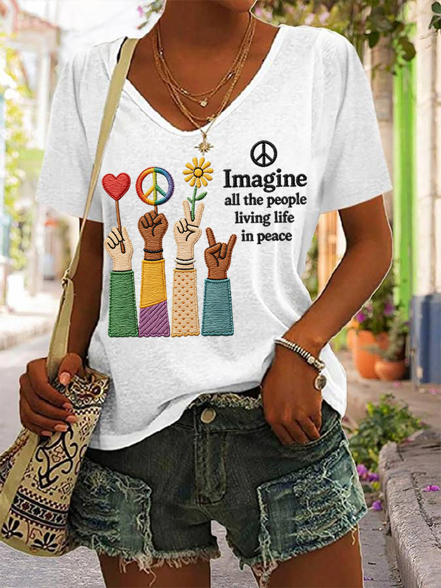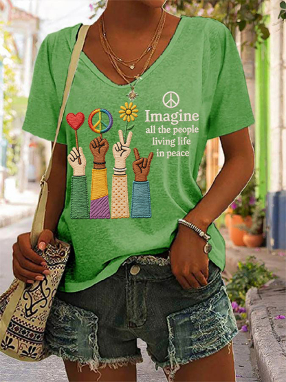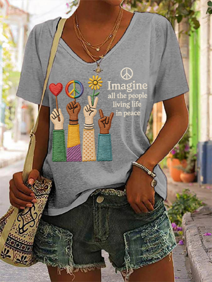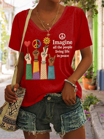 Women's Imagine All The People Living Life In Peace Print Casual V-neck Tee