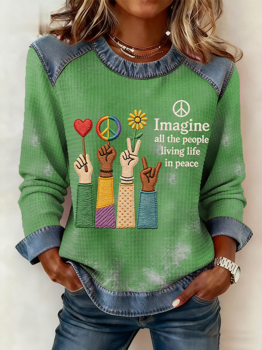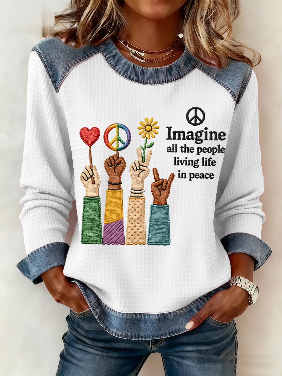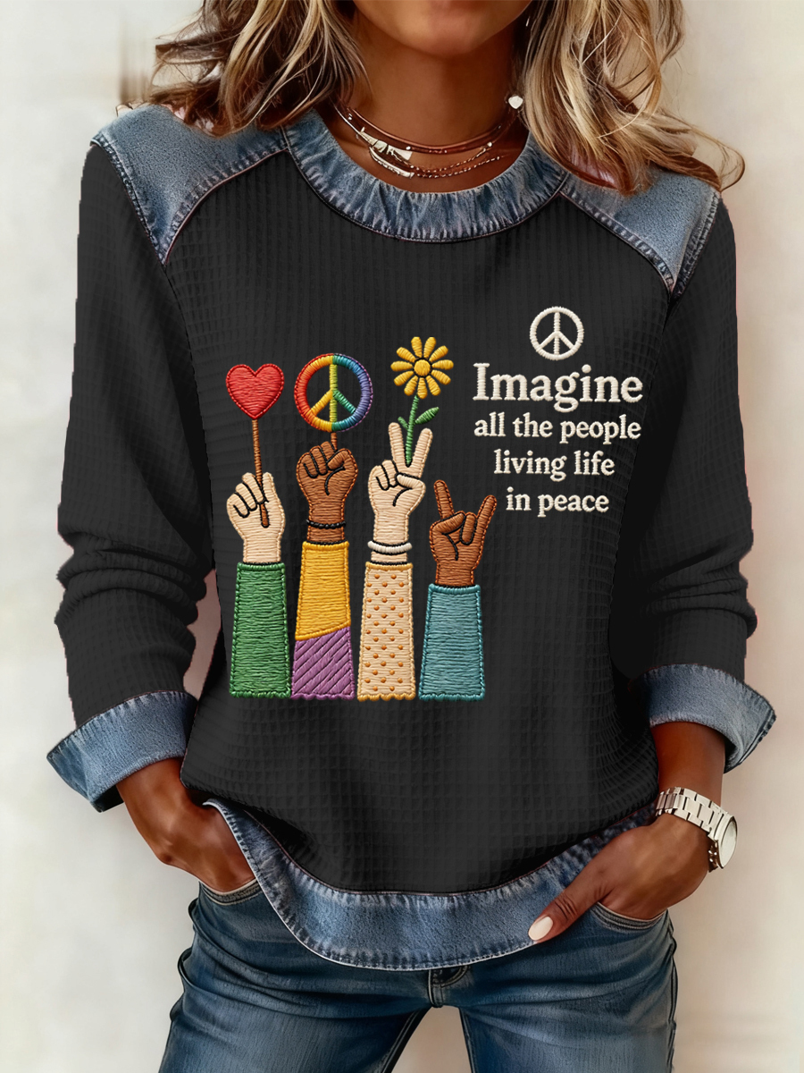 Women's Imagine All The People Living Life In Peace Print Denim Patchwork Top