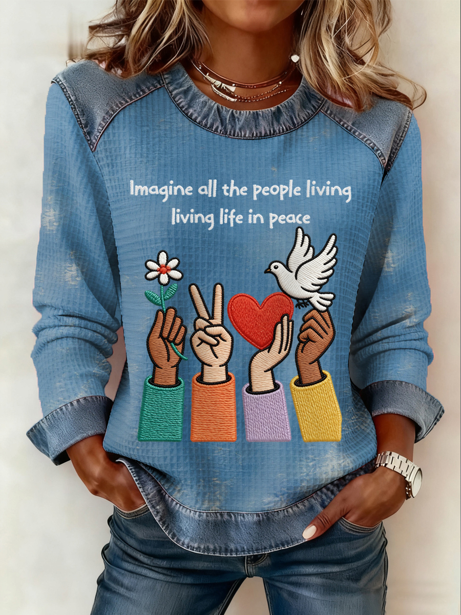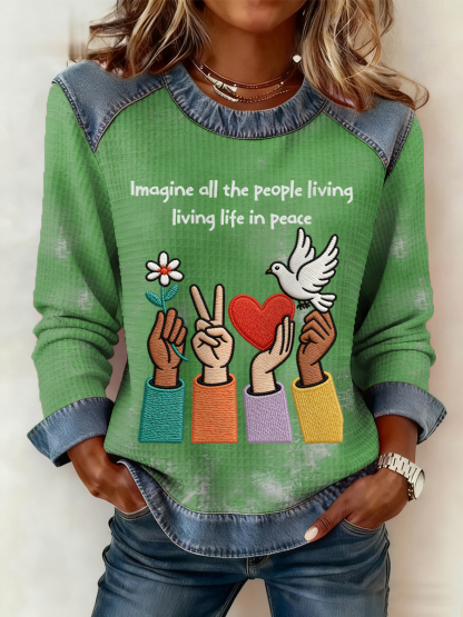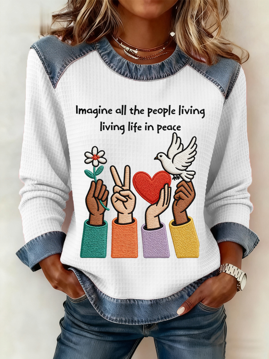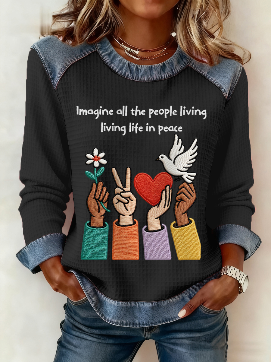Women's Imagine All The People Living Life In Peace Print Denim Patchwork Top