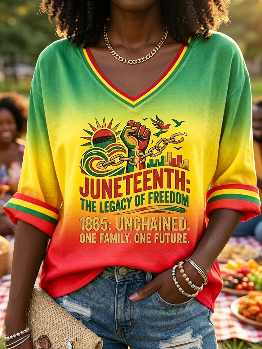 Women's Juneteenth Freedom Gradient Casual V-Neck T-Shirt