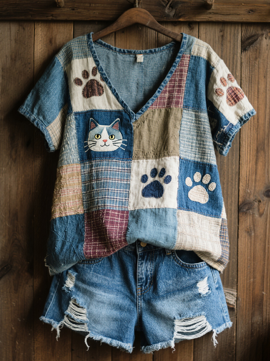 Women's Lovely Cat Patchwork Art V-Neck Top