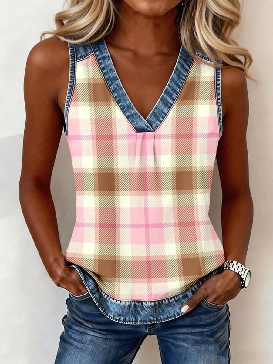 Women's Pink Plaid Print Denim Patchwork V-Neck Top