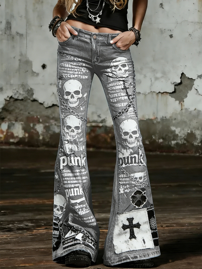 Women's Punk Skull Art Print Flared Trousers