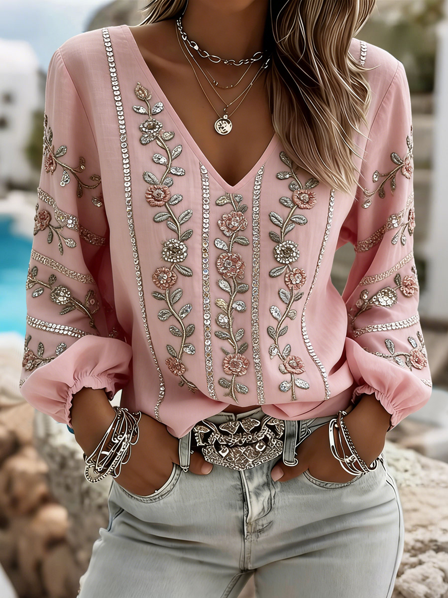 Women's Retro Floral Stripe Artistic Casual V-Neck Top