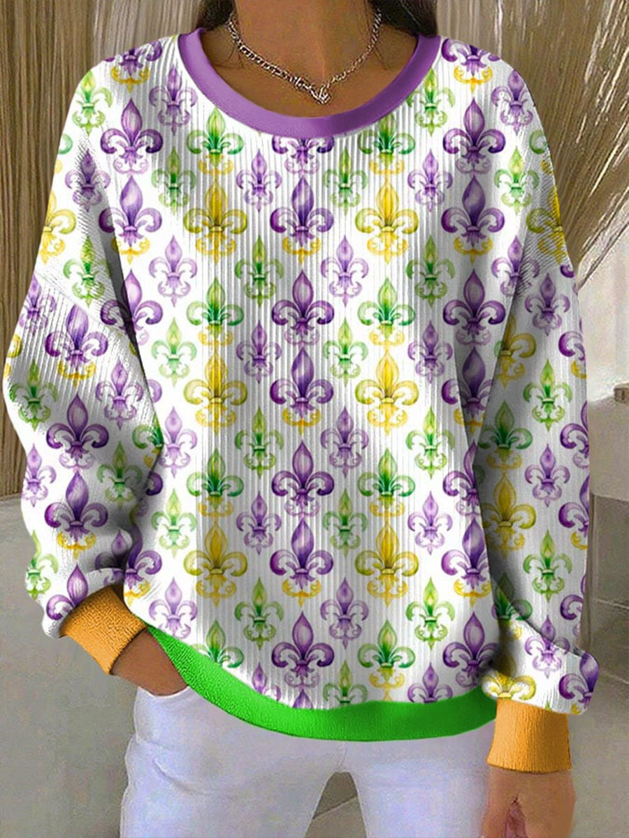 Women's Retro Mardi Gras Print Ribbed Round-Neck Sweatshirt