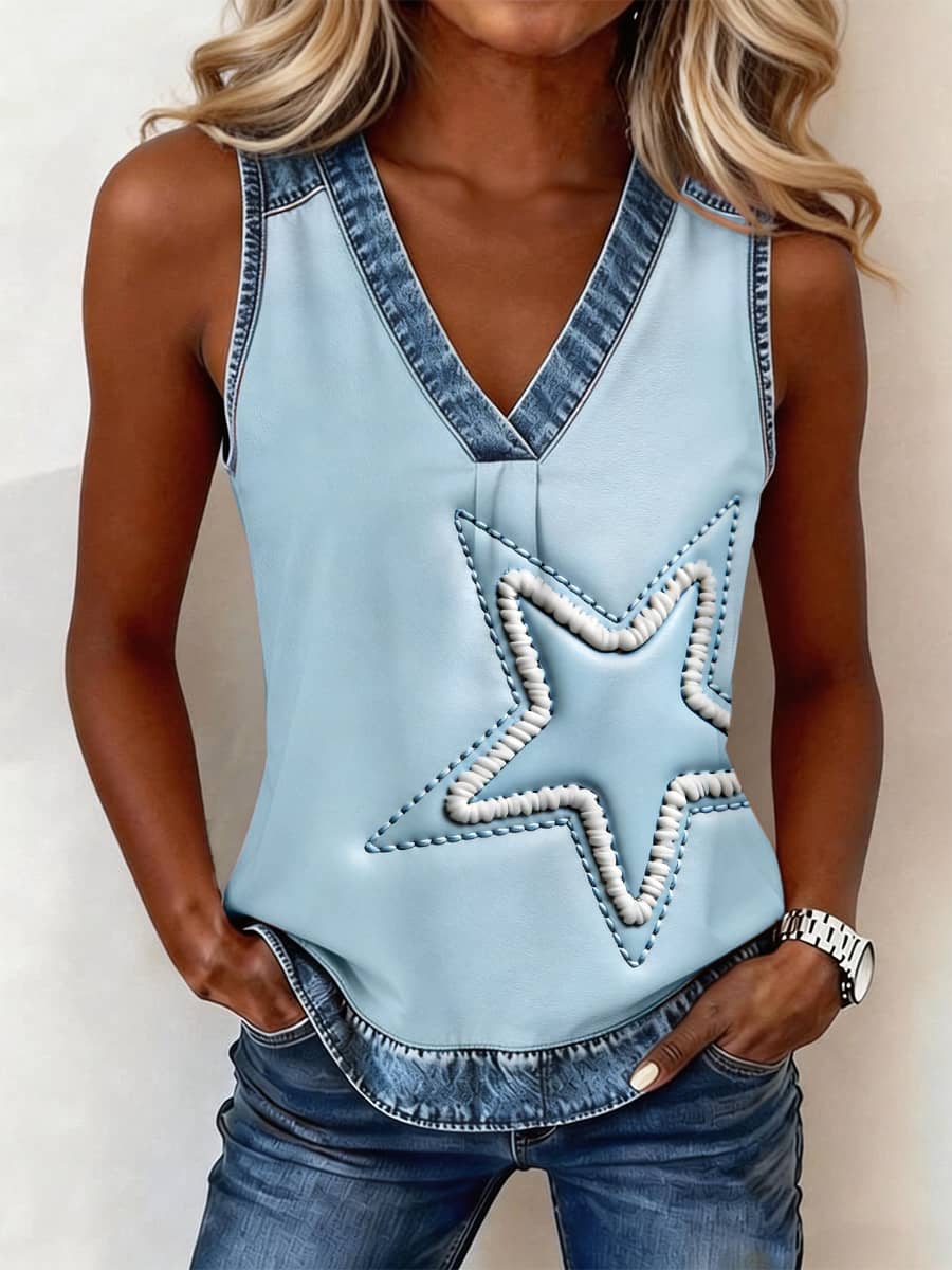 Women's Star Embroidery Pattern Denim Patchwork V-Neck Top