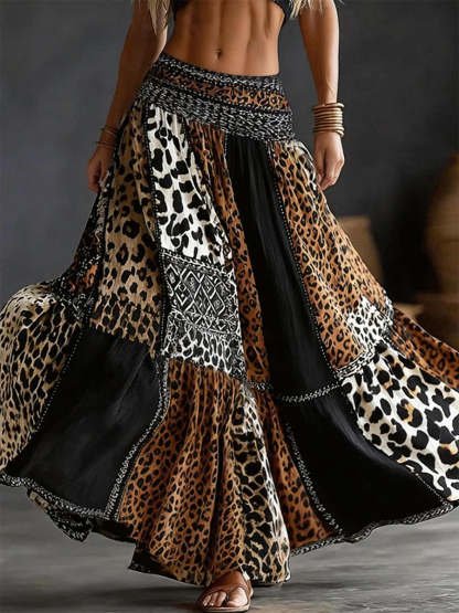 Women's Vintage Leopard Print Linen Blend Long Skirt