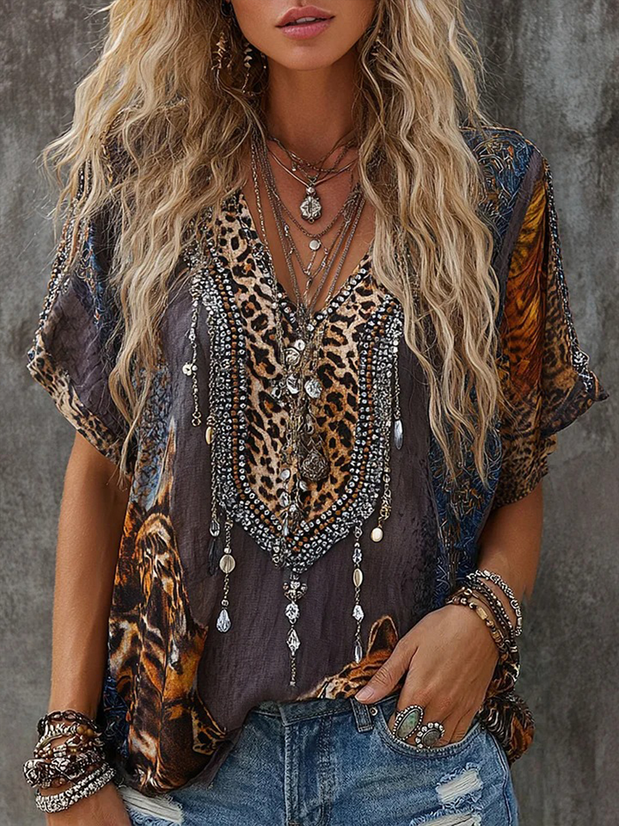 Women's Vintage Leopard Print Linen Blend V-Neck Shirt