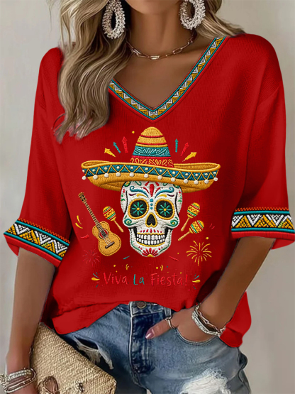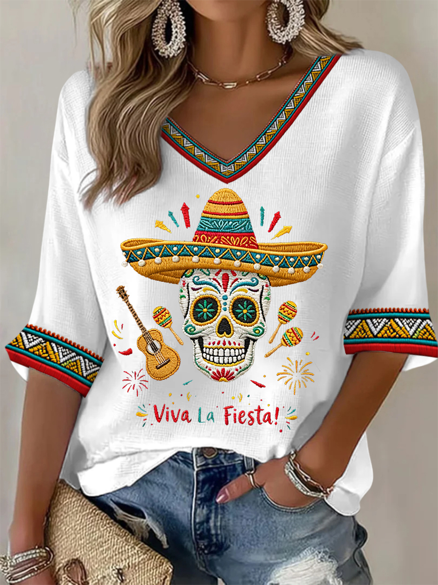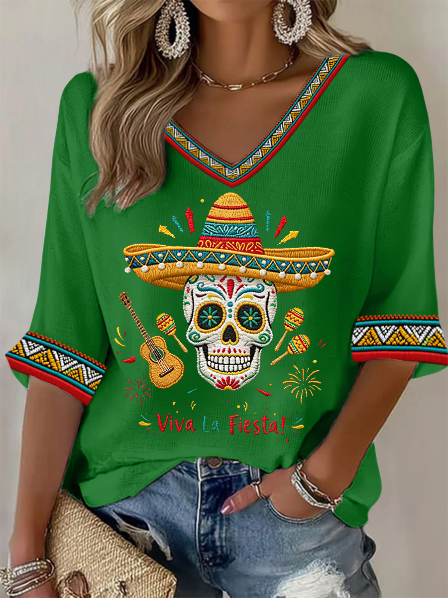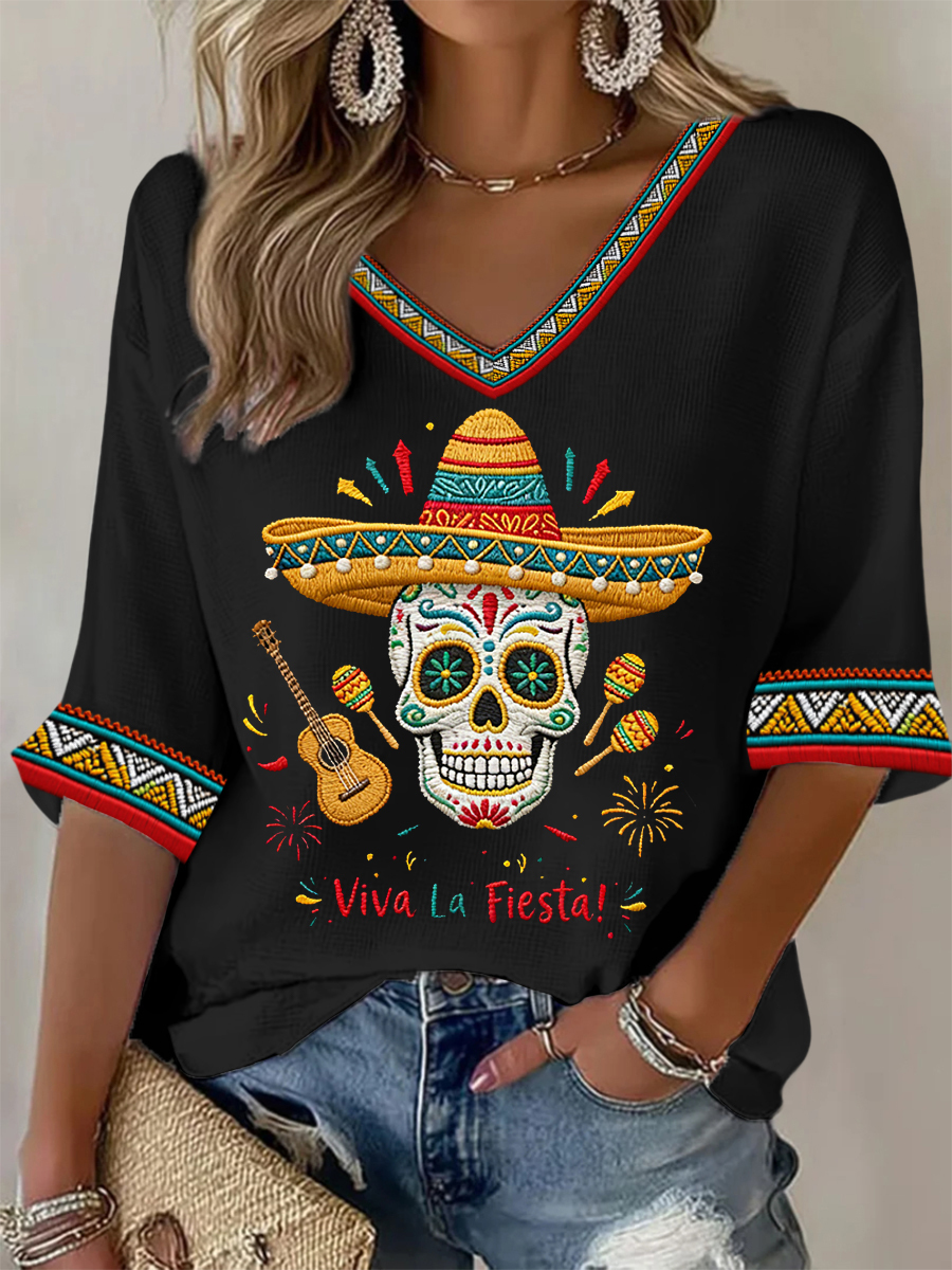 Women's Viva La Fiesta! Skeleton Print Casual Waffle Top