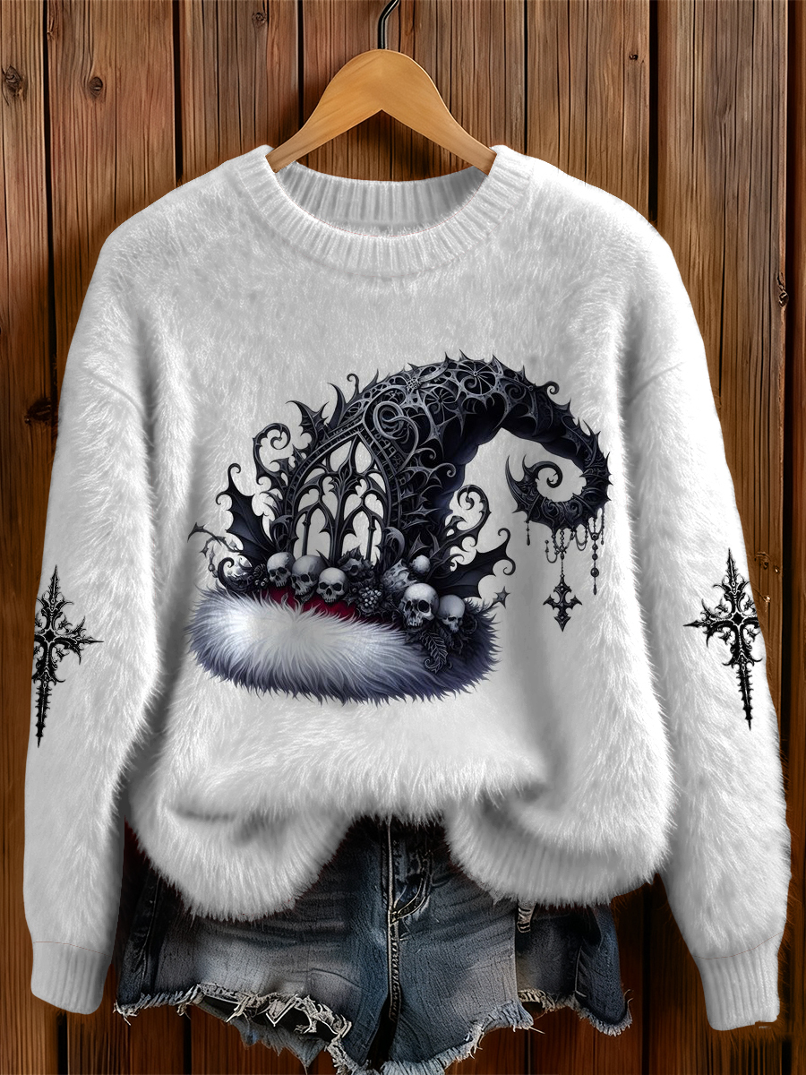 Womens' Gothic Christmas Hat Cross Printed Round Neck Comfortable Sweater