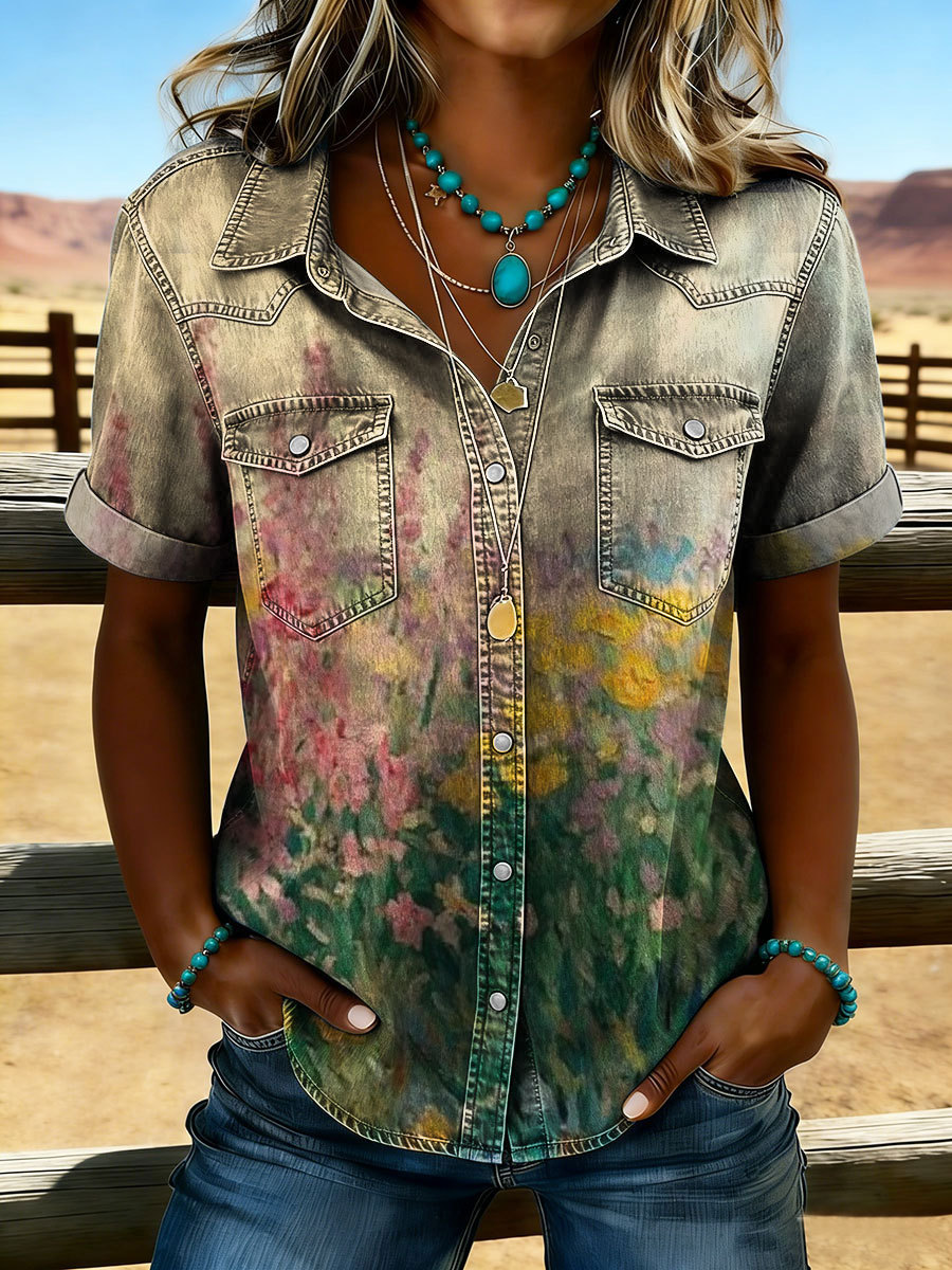 Women's Abstract Print Lapel Pocket Denim Shirt